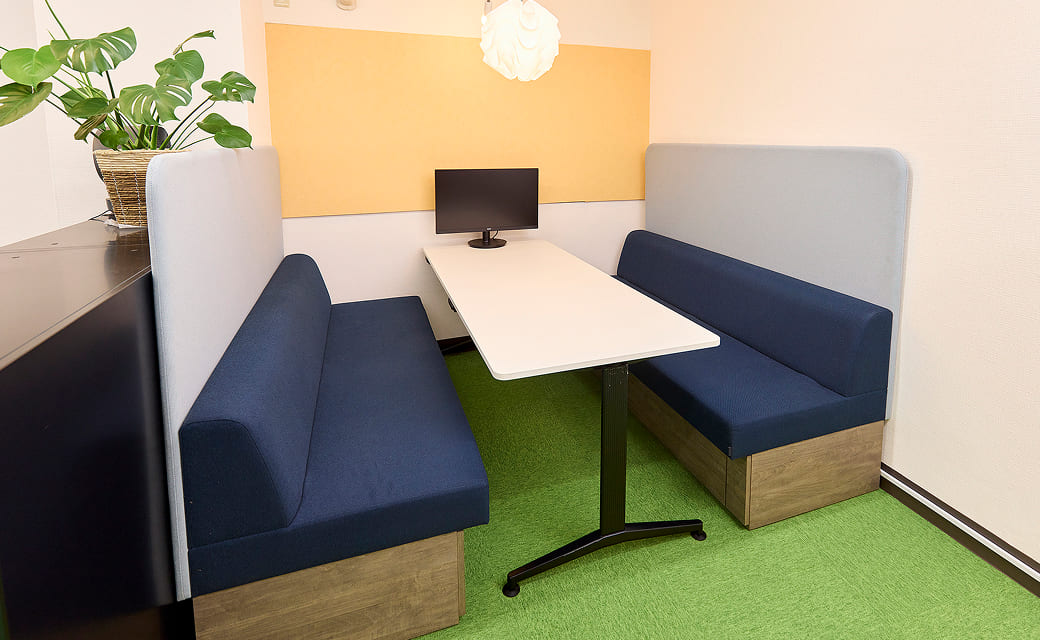室内を土足禁止にすることで、清潔な環境を保ち、靴を脱ぐことでよりリラックス効果の高い空間を提供しています。また、お客様との応接の場は、ファミレス席を導入し、会議室よりも和やかな雰囲気を醸し出しています。